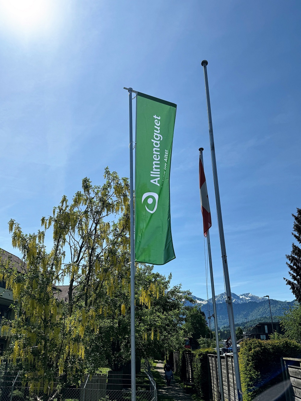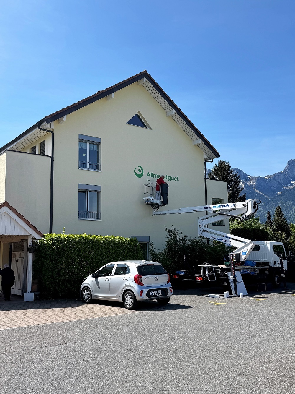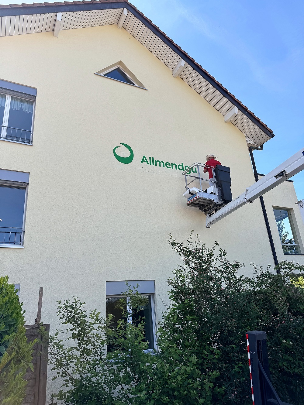 Nun ist der neue frische Look vom Allmendguet auch von weitem sichtbar. Das rund 3,5 Meter breite Logo wurde bei strahlendem Sonnenschein fachmännisch an der Hausfassade montiert. Begleitet von weiteren Beschilderungen und einer neuen Allmendguet-Fahne rund um das Haus.