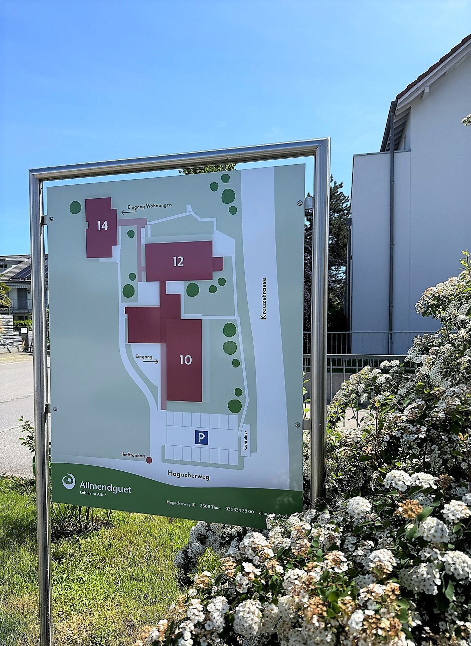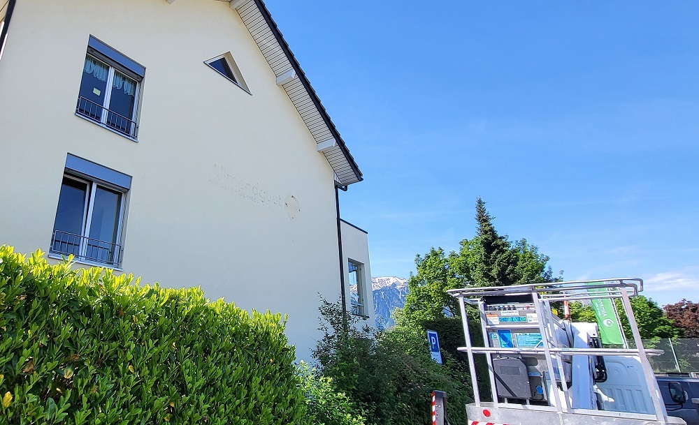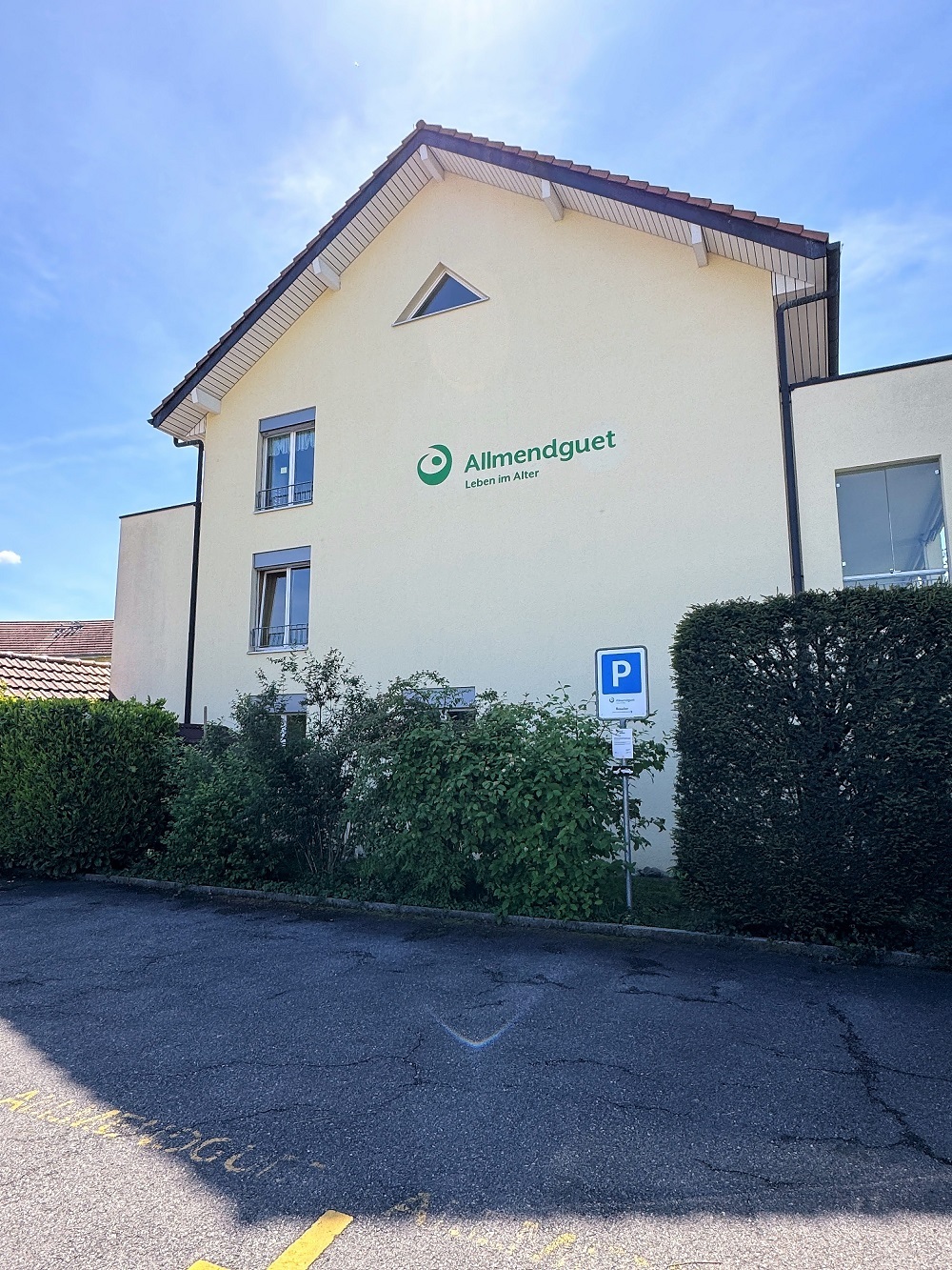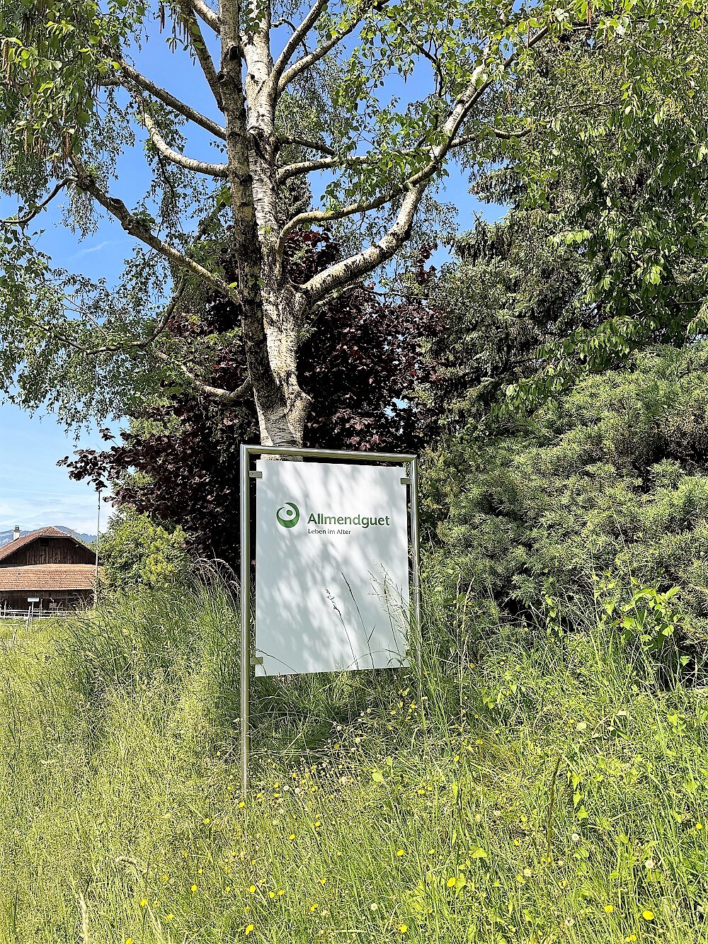 Nun ist der neue frische Look vom Allmendguet auch von weitem sichtbar. Das rund 3,5 Meter breite Logo wurde bei strahlendem Sonnenschein fachmännisch an der Hausfassade montiert. Begleitet von weiteren Beschilderungen und einer neuen Allmendguet-Fahne rund um das Haus.
